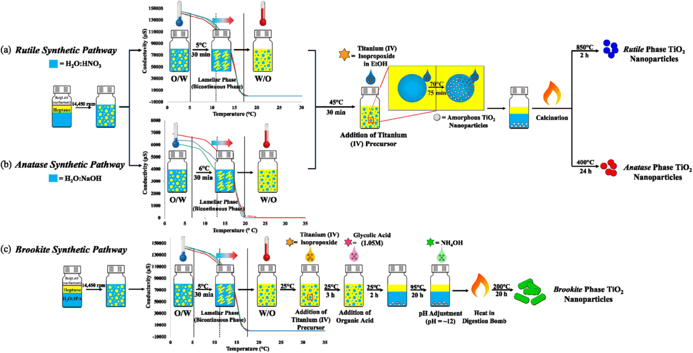 Schematic diagram of the PIT-nano-emulsion synthesis of (a) rutile, (b) anatase, and (c) brookite TiO2 highly-pure phase particles. The PIT determination graphs are inserted in each synthetic pathway, showing the inversion of phases at ∼11 °C for moderately and strongly acidic conditions (dashed line, light orange region) and ∼13 °C for alkaline conditions (dashed line, light pink region) (Vélez et al.)