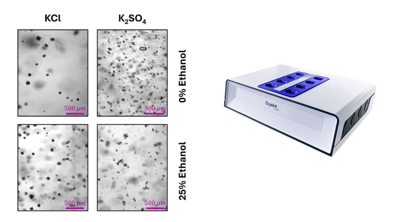 Potassium chloride and potassium sulfate were crystallized from water and 25 wt% ethanol–water mixtures. Solubility data obtained isothermally at 25 °C were used to design experiments at different initial supersaturations. Automated heating–cooling cycles in sealed 8 mL vials induced repeated dissolution and crystallization while real-time images of crystal number and size were collected. A constant stirring speed of 1000 rpm ensured homogeneous suspension, and images were captured at a magnification of 4 µm/pixel.