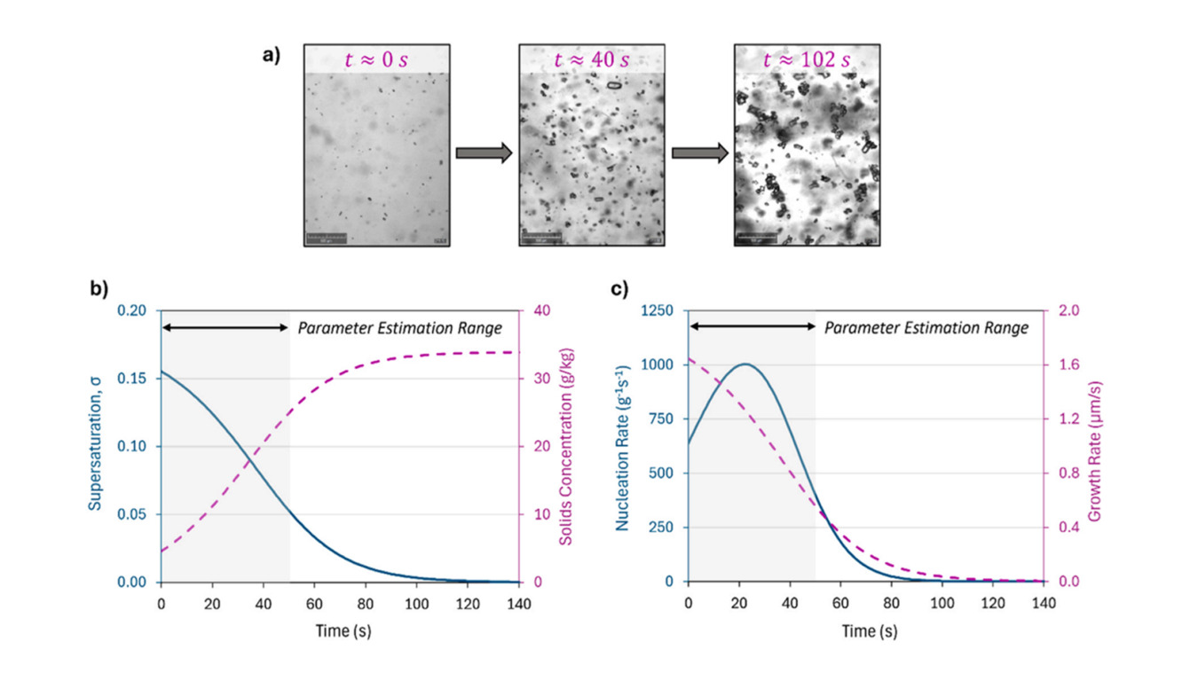 Figure 2: Model trends over the parameter estimation range. (a) Suspension images at different times. (b) Supersaturation and solids concentration. (c) Nucleation and growth rates. Gray areas show the estimation range, ending at image saturation.