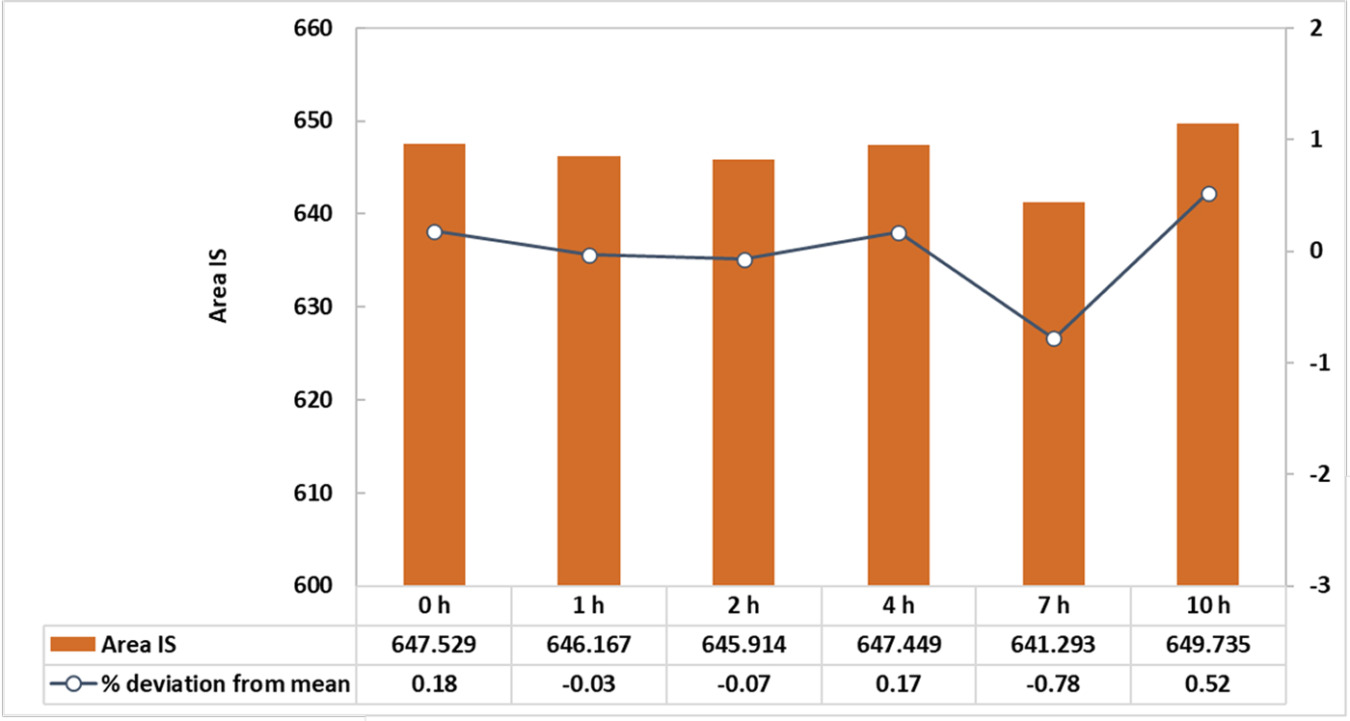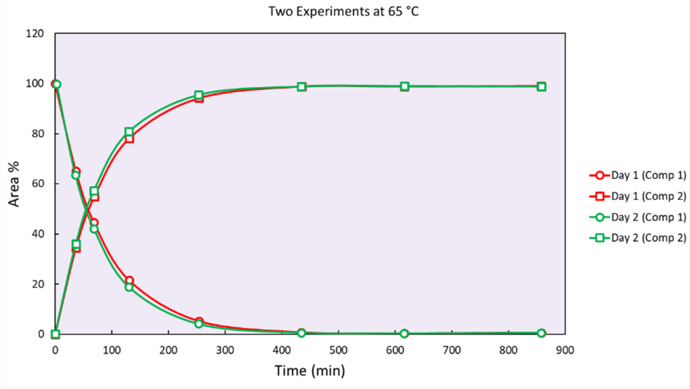 Automated fixed-volume sampling enabled consistent time-resolved sample collection, with less than 1 % deviation observed in internal standard measurements, as shown in Figure 1. In addition, solvent evaporation during extended experiments was minimal, ensuring stable reaction conditions. Duplicate experiments performed on different days produced nearly identical concentration–time profiles, highlighting the system’s strong day-to-day reproducibility (Figure 2).