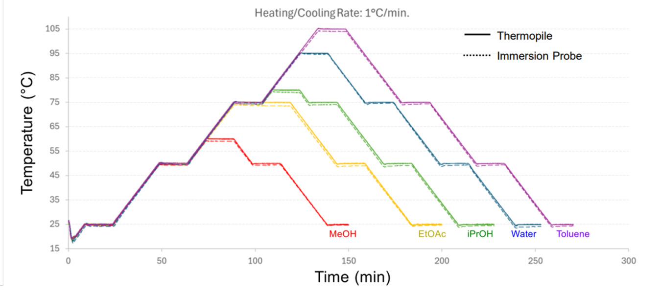 Accurate temperature regulation is critical in kinetic experiments because reaction rates are highly temperature dependent. ReactALL employs a contactless infrared thermopile system to measure the internal reactor temperature in real time and dynamically adjust the jacket temperature. The thermopile sensor was validated against an internal temperature probe across different solvents, showing excellent agreement between the two measurement methods and confirming accurate, reliable contactless temperature measurement across various reaction media (Figure 3).