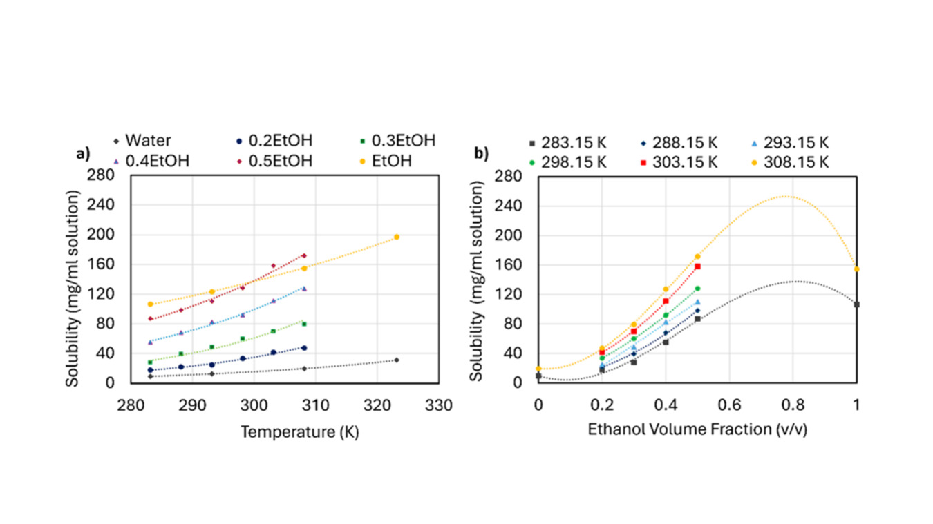 Solubility was found to increase with ethanol content, reaching a maximum at intermediate ethanol–water ratios. The effect of temperature on solubility was more pronounced in ethanol-rich mixtures than in pure water (Figure 1).