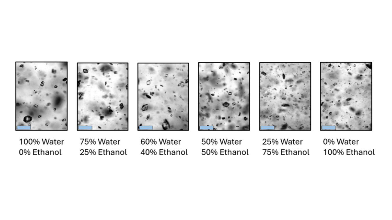 Figure 2: Microscopic images from Crystalline showing acetaminophen crystals in various ethanol–water fractions ~1 min after nucleation at 10 °C. Scale bars: 500 μm.