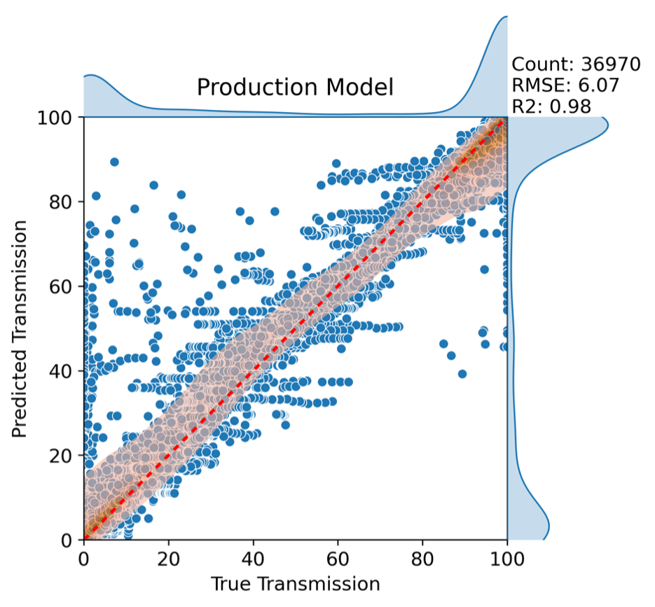 The curated dataset was used to compare multiple solvent fingerprinting approaches, including Morgan, Kurotani, and Hansen descriptors, aimed at capturing solvent structural effects on polymer solubility. For polymers, a one-hot encoding scheme was applied to represent different polymer systems without introducing additional structural descriptors. These inputs were then used to train and evaluate random forest, XGBoost, and neural network models under a robust validation framework. One challenge associated with the dataset is that transmission values are heavily weighted toward 0% and 100%, reflecting systems that are either fully insoluble or fully soluble under the tested conditions. The final production model shown in Figure 2 was built using XGBoost with Morgan fingerprints and demonstrated strong predictive performance, achieving a root mean square error (RMSE) of approximately 6% and an R² of 0.98, indicating that it captures the majority of variability in the transmission data.