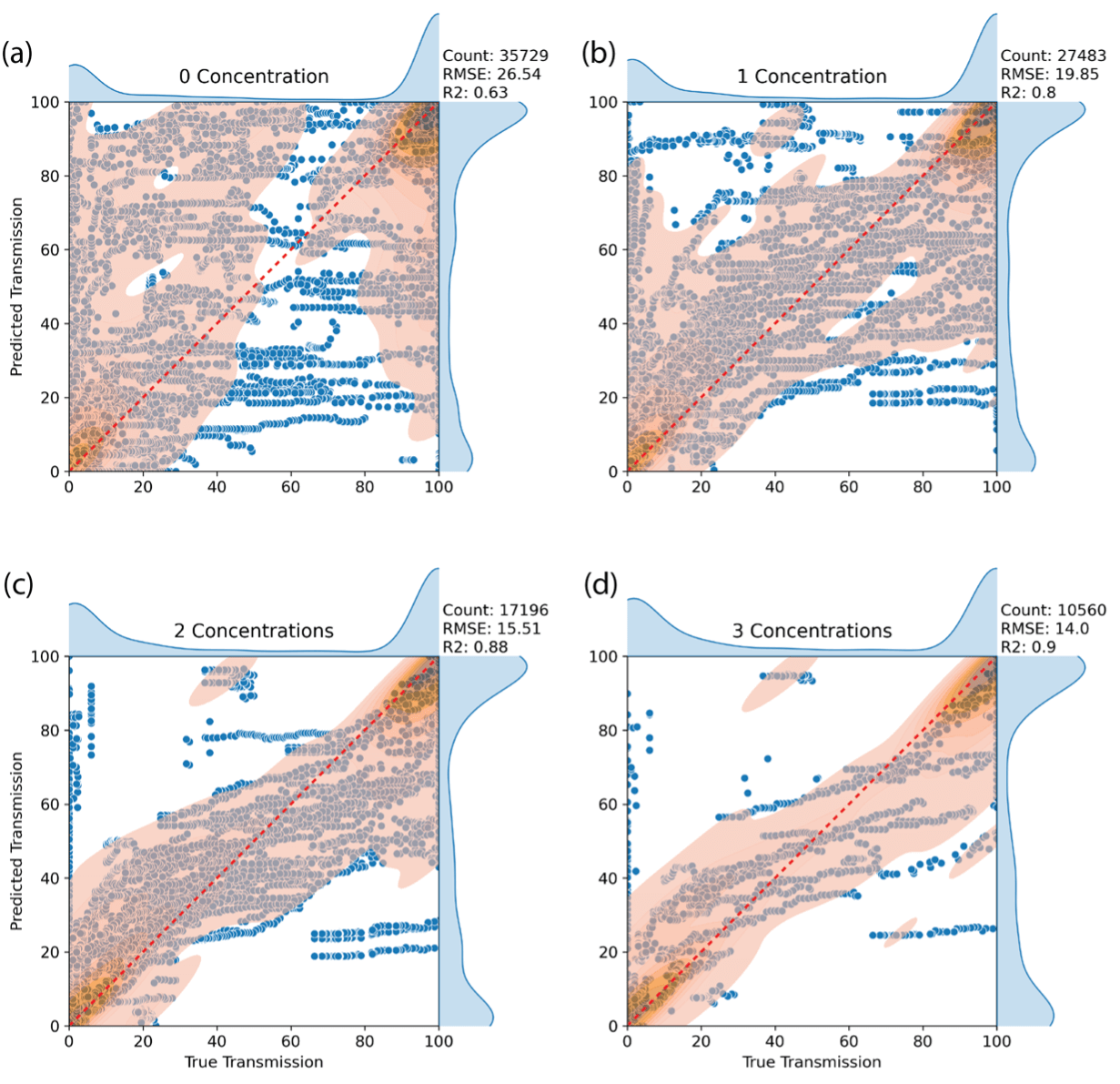 Figure 2: Predictions from the production XGBoost model trained with Morgan solvent fingerprints. The central two-dimensional kernel density estimate (KDE) highlights regions of highest data concentration, with darker orange indicating greater density. Marginal one-dimensional KDEs show the distributions of experimental transmission values (top) and model-predicted transmission values (right).