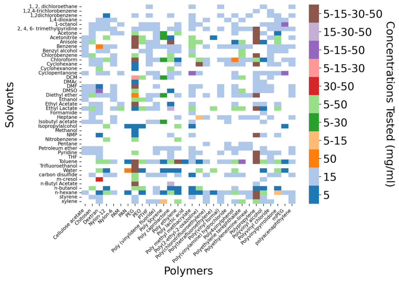 The polymers were chosen to span a diverse range of functional groups with most polymers falling below 15 kDa to minimize kinetic limitations and improve alignment with equilibrium behavior. Solvents were likewise selected to cover a broad polarity spectrum, including nonpolar, polar protic, and polar aprotic classes, ensuring wide chemical diversity within the dataset. The heatmap of the polymer-solvent pairs and their respected concentration is shown in Figure 1.